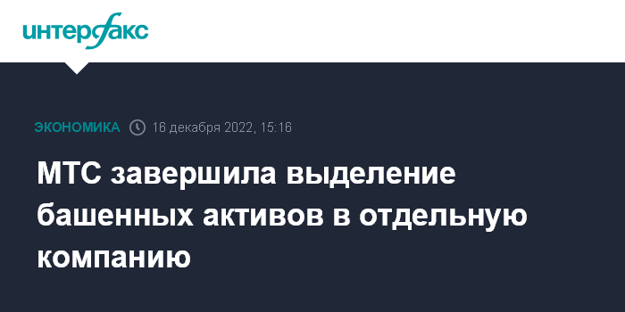 Москва. 16 декабря. INTERFAX.RU - ПАО "МТС" завершило реорганизацию в форме выделения ООО "Башенная инфраструктурная компания" (БИК), говорится в сообщении оператора.