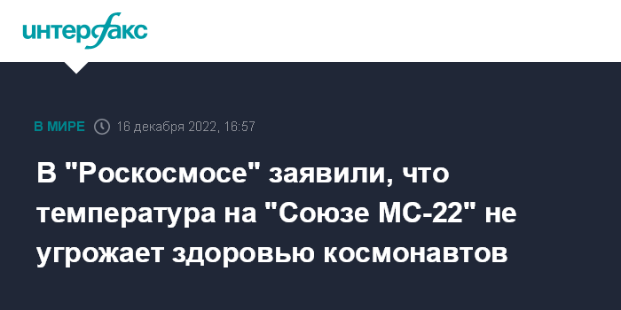 Москва. 16 декабря. INTERFAX.RU - Температура на борту корабля "Союз МС-22" составляет 30 градусов Цельсия, что является незначительным изменением температурного режима, здоровью экипажа МКС ничего не угрожает, заявили в "Роскосмосе".