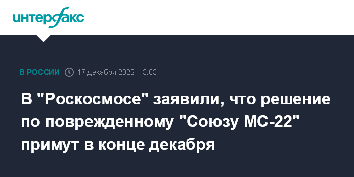 Москва. 17 декабря. INTERFAX.RU - Решения по ситуации с поврежденным кораблем "Союз МС-22", который пристыкован к МКС, будут приняты в конце декабря, заявили в "Роскосмосе".
