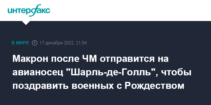 Москва. 17 декабря. INTERFAX.RU - Президент Франции Эммануэль Макрон, который в воскресенье посетит финал Чемпионата мира по футболу в Катаре, отправится в понедельник на авианосец "Шарль-де-Голль", находящийся у берегов Египта, сообщают французские СМИ.