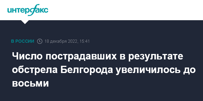 Москва. 18 декабря. INTERFAX.RU - Губернатор Белгородской области Вячеслав Гладков уточнил, что в результате обстрела в воскресенье украинской стороной Белгорода ранения получили восемь мирных жителей.