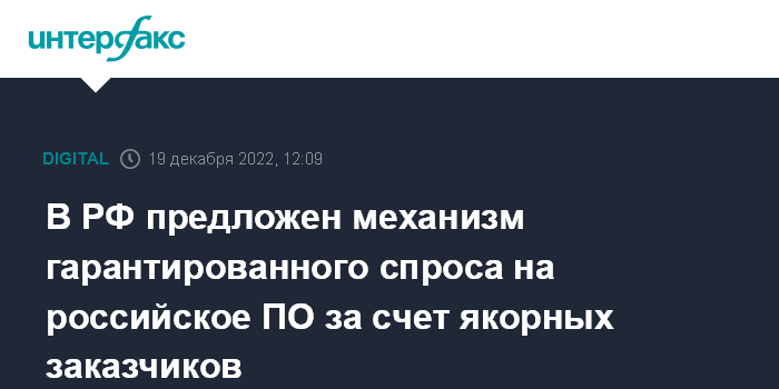 Москва. 19 декабря. INTERFAX.RU - Минцифры РФ предложило ввести новую меру поддержки разработчиков общесистемного и промышленного программного обеспечения (ПО), которая должна обеспечить гарантированный спрос на российские IT-решения за счет якорных заказчиков и предоставить преференции в госзакупках, сообщил журналистам в понедельник глава ведомства Максут Шадаев.