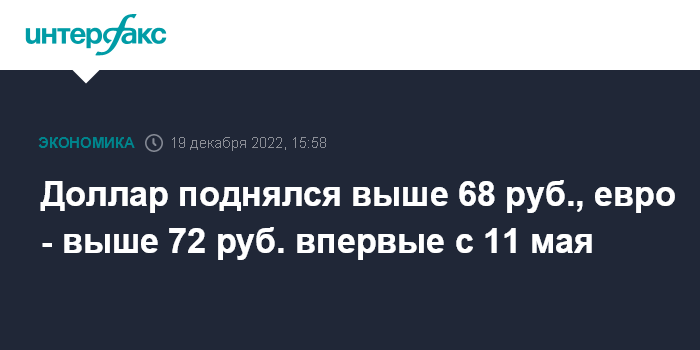 Москва. 19 декабря. INTERFAX.RU - Доллар США и евро уверенно растут на Московской бирже в понедельник днем; в ожидании решения о потолке цен на российский газ доллар поднялся выше 68 руб., а евро - 72 руб. впервые с 11 мая.