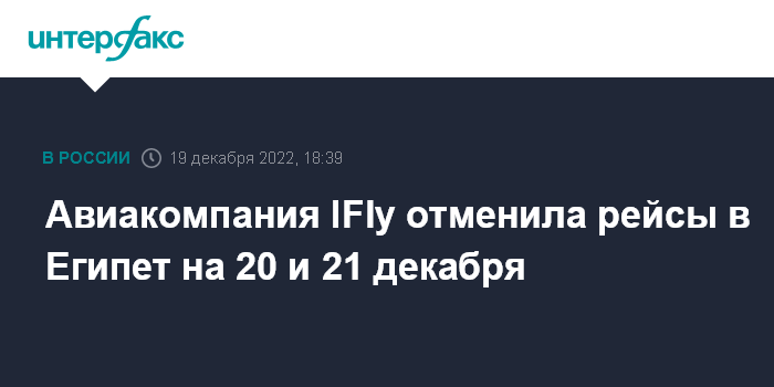 "Авиакомпания IFly вынужденно отменяет вылеты в Хургаду и Шарм-эль-Шейх, которые должны были состояться 20 и 21 декабря. Об этом перевозчик уведомил нас в понедельник. Информация о дополнительных вариантах авиаперелета из Египта в связи с отменой рейсов на 20 и 21 декабря ожидается в ближайшее время", - рассказали в компании.