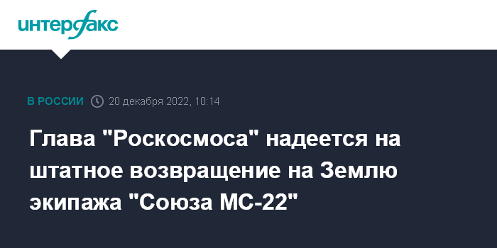 Москва. 20 декабря. INTERFAX.RU - Глава "Роскосмоса" Юрий Борисов заявил, что специалисты сделают все возможное для безопасного и штатного возвращения на Землю экипажа корабля "Союз МС-22" с Международной космической станции (МКС).