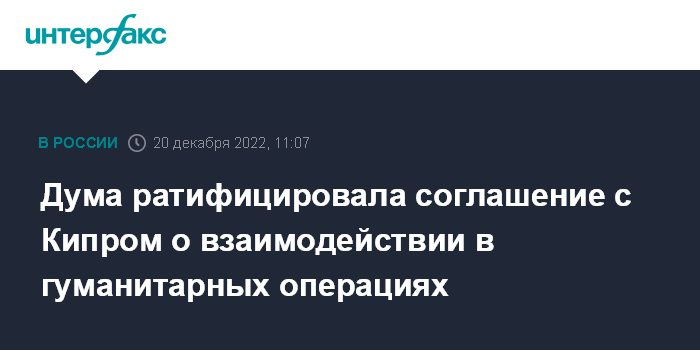 Москва. 20 декабря. INTERFAX.RU - Госдума во вторник ратифицировала соглашение между РФ и Кипром о создании условий для проведения гуманитарных операций, включая эвакуацию граждан с территории третьих стран с использованием территории и инфраструктуры Республики Кипр.