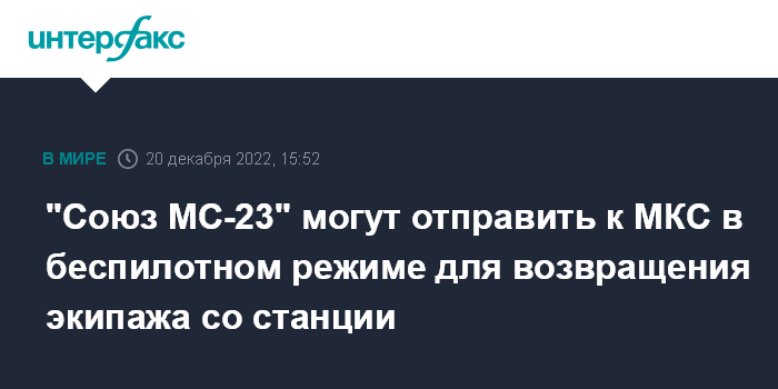 Москва. 20 декабря. INTERFAX.RU - Корабль "Союз МС-23" может полететь к Международной космической станции (МКС) в беспилотном режиме для возвращения экипажа "Союз МС-22" на Землю, сообщил глава "Роскосмоса" Юрий Борисов.