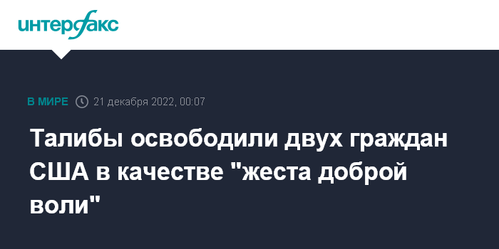 Москва. 21 декабря. INTERFAX.RU - Контролирующее Афганистан движение "Талибан" (запрещенная в РФ террористическая организация) освободило двух американцев, содержавшихся под стражей, сообщил представитель госдепа Нед Прайс во вторник.