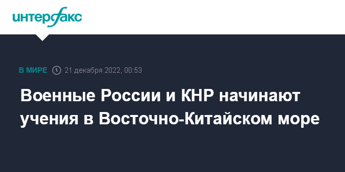 Российско-китайское военно-морское учение "Морское взаимодействие-2022" пройдет в акватории Восточно-Китайского моря с 21 по 27 декабря, сообщили ранее в Минобороны РФ.
