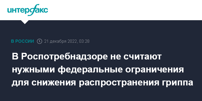 Москва. 21 декабря. INTERFAX.RU - Решение о введении каких-либо ограничительных мер из-за роста заболеваемости гриппом и ОРВИ принимают регионы с учетом эпидситуации, на федеральном уровне нет необходимости вводить ограничения, сообщила в интервью "Интерфаксу" заместитель директора по клинико-аналитической работе ЦНИИ эпидемиологии Роспотребнадзора Наталья Пшеничная.