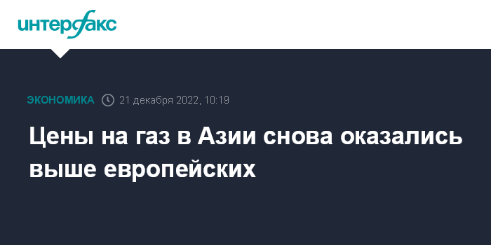 Москва. 21 декабря. INTERFAX.RU - Локальное проседание цен на газ в Европе не в полной мере отразилось на Азии - котировки там оказались снова выше европейских.