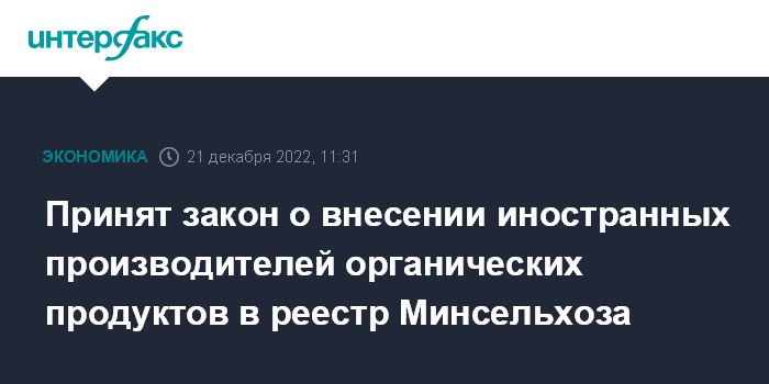 Принятый закон предлагает включать в реестр юридических лиц-производителей органической продукции, созданных в соответствии с законодательством иностранных государств. В пояснительных материалах уточняется, что речь идет об органических производствах, прошедших сертификацию исходя из требований российского законодательства.