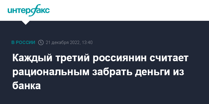 Москва. 21 декабря. INTERFAX.RU - Забирать свои деньги из банка, если таковые там имеются, на данный момент считают рациональным 35% россиян, свидетельствуют данные опроса ВЦИОМ, опубликованные в среду на официальном сайте социологического института.