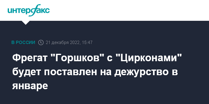 Москва. 21 декабря. INTERFAX.RU - Фрегат "Адмирал флота Горшков" с гиперзвуковыми ракетами "Циркон" выйдет на боевую службу в январе 2023 года, заявил на коллегии Минобороны президент Владимир Путин.