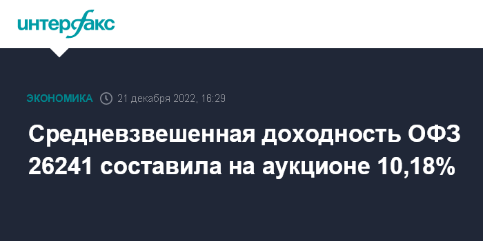 Средневзвешенная доходность ОФЗ 26241 составила на аукционе 10,18%