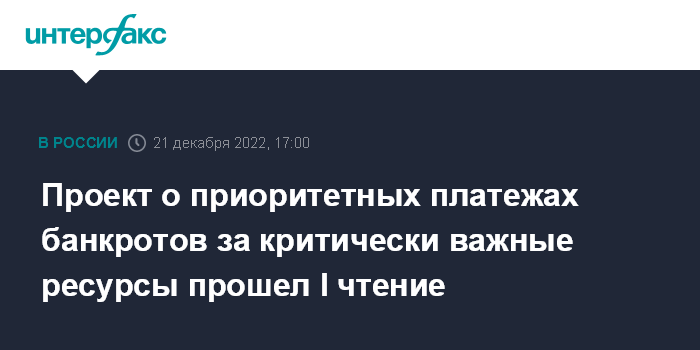 Проект о приоритетных платежах банкротов за критически важные ресурсы прошел I чтение