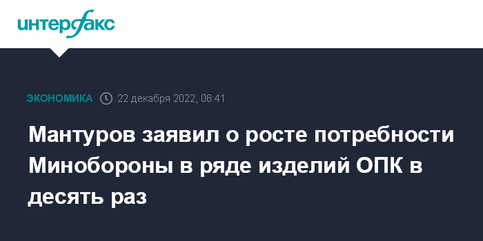 Москва. 22 декабря. INTERFAX.RU - Министерство обороны РФ поставило в 2022 году задачу увеличить в десять раз выпуск ряда образцов продукции, необходимой для решения задач специальной военной операции (СВО), сообщил заместитель председателя правительства, министр промышленности и торговли РФ Денис Мантуров.