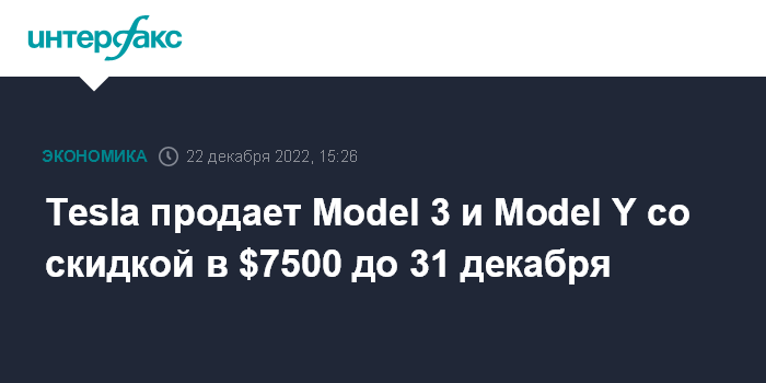 Москва. 22 декабря. INTERFAX.RU - Компания Tesla объявила, что продает электромобили Model 3 и Model Y со скидкой в $7500 в период с 21 по 31 декабря.