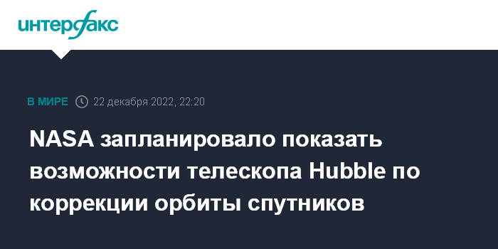 Москва. 22 декабря. INTERFAX.RU - Национальное управление США по аэронавтике и исследованию космического пространства (NASA) планирует использовать обсерваторию Hubble для демонстрации технологий коррекции орбиты космических аппаратов, следует из текста запроса, опубликованного на сайте агентства о перспективных контрактах.