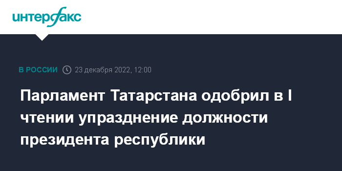 Москва. 23 декабря. INTERFAX.RU - Депутаты Госсовета Татарстана большинством голосов приняли в первом чтении проект закона о внесении изменений в Конституцию республики, предусматривающий, в том числе, упразднение должности президента Татарстана, передал корреспондент "Интерфакса" с заседания.