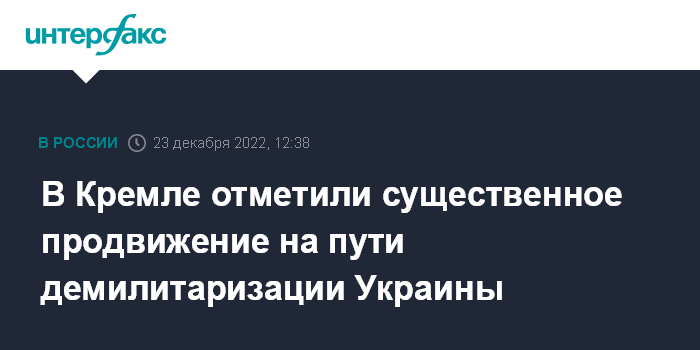 Москва. 23 декабря. INTERFAX.RU - В Кремле отмечают существенное продвижение российских военных в достижении цели демилитаризации Украины.