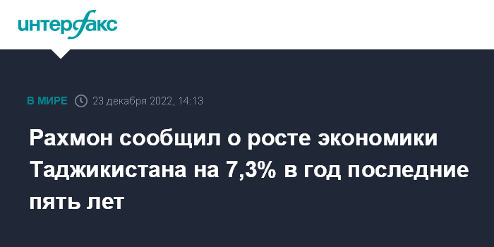 Москва. 23 декабря. INTERFAX.RU - Президент Таджикистана Эмомали Рахмон заявил в послании к парламенту, что экономика страны на протяжении последних пяти лет, несмотря на отрицательное влияние внешних факторов, росла на уровне 7,3%.