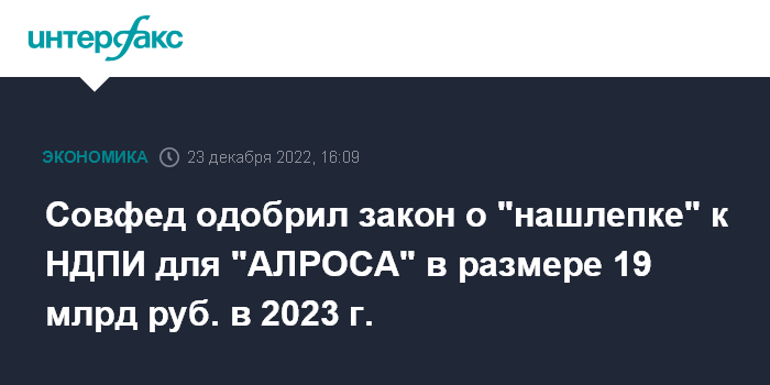 Москва. 23 декабря. INTERFAX.RU - Совет Федерации одобрил в пятницу закон с поправками в Налоговый кодекс (НК) РФ о введении дополнительных изъятий через НДПИ в 2023 г. у компании "АЛРОСА" в размере 19 млрд рублей.
