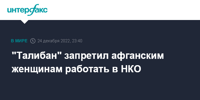 Москва. 24 декабря. INTERFAX.RU - Контролируемое талибами ("Талибан" - запрещенная в РФ террористическая организация) правительство Афганистана приказало всем местным и иностранным неправительственным организациям (НПО) не допускать на работу женщин, сообщает The Guardian со ссылкой на письмо афганского министерства экономики.