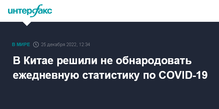Москва. 25 декабря. INTERFAX.RU - Национальная комиссия здравоохранения КНР с воскресенья прекратила публиковать ежедневную статистику по ситуации с COVID-19, сообщает Channel NewsAsia.