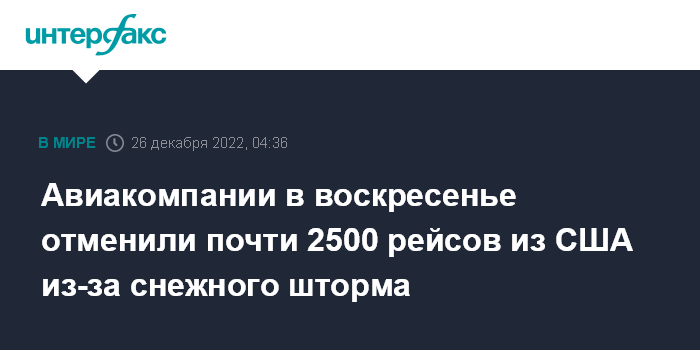 Москва. 26 декабря. INTERFAX.RU - Около 2500 авиарейсов из США были отменены в воскресенье из-за снежного шторма, обрушившегося на большую часть страны, пишет The Hill со ссылкой на данные сайта FlightAware. Еще 6061 рейс был задержан.