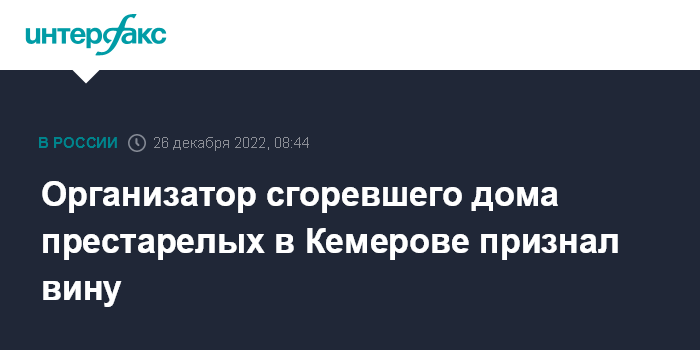 Москва. 26 декабря. INTERFAX.RU - Следователь, который ведет дело о гибели 22 человек при пожаре в нелегальном доме престарелых в Кемерове, сообщил, что организовавший приют Андрей Смирнов признал вину.