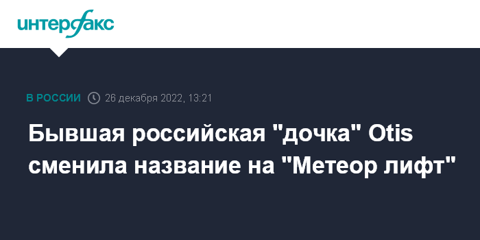 Москва. 26 декабря. INTERFAX.RU - Компания "Отис лифт", бывшая "дочка" американской Otis Worldwide Corporation, переименована в "Метеор лифт".