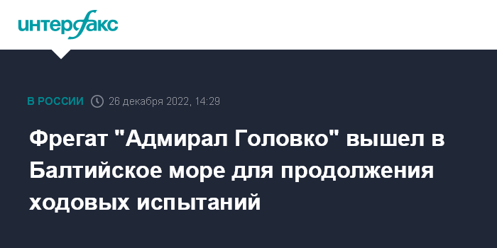 Москва. 26 декабря. INTERFAX.RU - Новый фрегат "Адмирал Головко", носитель крылатых ракет "Калибр", вышел в полигоны Балтийского моря для продолжения заводских ходовых испытаний, сообщило министерство обороны РФ в понедельник.
