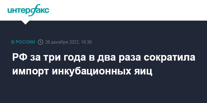 "Мы раньше импортировали 800 млн инкубационных яиц, в этом году – 400 млн штук с небольшим. А производство мяса увеличивается по итогам года. То есть мы заместили (импорт - ИФ) своей продукцией, не из других стран", - сказал он.
