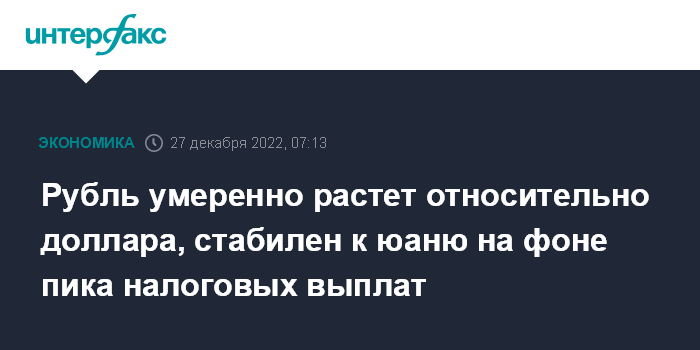 Москва. 27 декабря. INTERFAX.RU - Доллар США умеренно снижается, юань стабилен на Московской бирже на старте торгов во вторник, рубль растет на фоне пика налоговых выплат компаний-экспортеров.