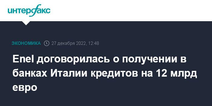 Москва. 27 декабря. INTERFAX.RU - Итальянская энергетическая компания Enel S.p.A. получила одобрение на открытие возобновляемой кредитной линии на сумму 12 млрд евро в ряде итальянских банков для обеспечения залоговых требований торговых операций Enel и Enel Global Trading S.p.A. на энергетических рынках.
