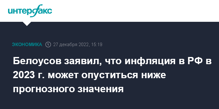 Москва. 27 декабря. INTERFAX.RU - Инфляция в РФ в 2023 году может опуститься ниже планки официального прогноза, создавая условия для смягчения денежно-кредитной политики, считает первый вице-премьер Андрей Белоусов.