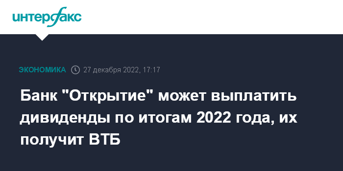 Банк "Открытие" может выплатить дивиденды по итогам 2022 года, их получит ВТБ