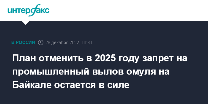Москва. 28 декабря. INTERFAX.RU - Росрыболовство сохраняет планы по снятию в 2025 году запрета на промышленный вылов омуля в Байкале, заявил на пресс-конференции глава ведомства Илья Шестаков.