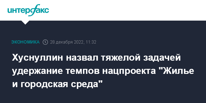 Москва. 28 декабря. INTERFAX.RU - Удержать темпы реализации национального проекта "Жилье и городская среда" будет очень тяжело, заявил телеканалу "Россия 24" вице-премьер Марат Хуснуллин.