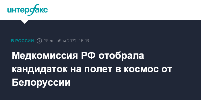 Москва. 28 декабря. INTERFAX.RU - Главная медицинская комиссия отобрала кандидаток из Белоруссии на полет в космос, рекомендации для выбора основной и дублирующей космонавтки направлены белорусской стороне, сообщает "Роскосмос".