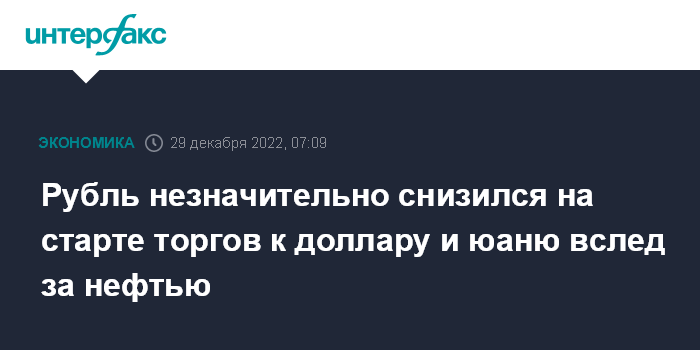 Москва. 29 декабря. INTERFAX.RU - Доллар США и юань незначительно подрастают на Московской бирже на старте торгов в четверг, рубль наметил снижение с учетом негативных настроений на фондовых площадках и отрицательной динамики нефти.