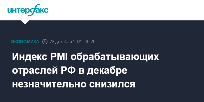 Москва. 29 декабря. INTERFAX.RU - Индекс PMI обрабатывающих отраслей РФ в декабре 2022 года составил 53 пункта, слегка опустившись с ноябрьских 53,2 пункта, говорится в материалах исследования S&P Global.