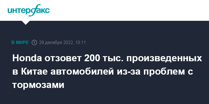 Москва. 29 декабря. INTERFAX.RU - Японский автопроизводитель Honda Motor Co отзывает более 200 тысяч автомобилей, произведенных в Китае, из-за проблем с датчиками тормозной системы.