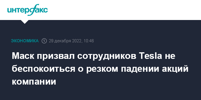 Москва. 29 декабря. INTERFAX.RU - Американский миллиардер Илон Маск в предновогоднем обращении к сотрудникам Tesla Inc. посоветовал им не беспокоиться о резком падении акций компании, пишет CNBC, получивший доступ ко внутреннему сообщению.