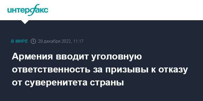 Москва. 29 декабря. INTERFAX.RU - Правительство Армении на заседании в четверг приняло проект поправок в Уголовный кодекс, согласно которому криминализируются действия по отказу от суверенитета республики.
