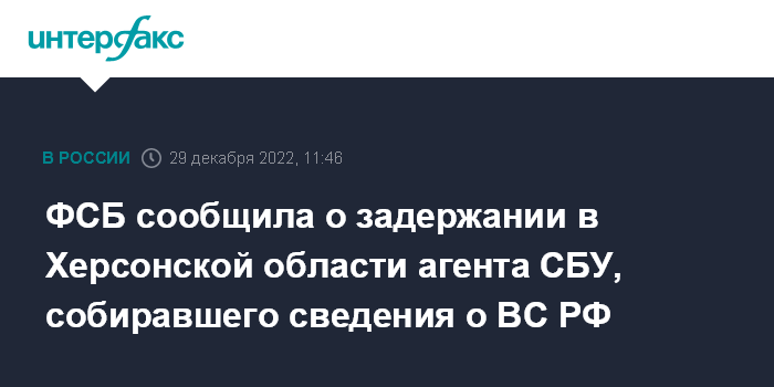Москва. 29 декабря. INTERFAX.RU - ФСБ сообщила о задержании в Херсонской области агента украинских спецслужб, собиравшего сведения о местах дислокации и численности подразделений Вооруженных сил РФ в зоне специальной военной операции.