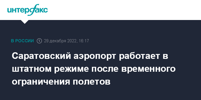 Москва. 29 декабря. INTERFAX.RU - Саратовский аэропорт "Гагарин" работает в штатном режиме после временного ограничения полетов, вводившегося ранее в четверг.