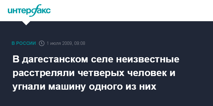 Москва. 1 июля. INTERFAX.RU - На окраине села Нечаевки Кизилюртовского района Дагестана неизвестные расстреляли четверых человек, сообщил "Интерфаксу" в среду источник в правоохранительных органах.