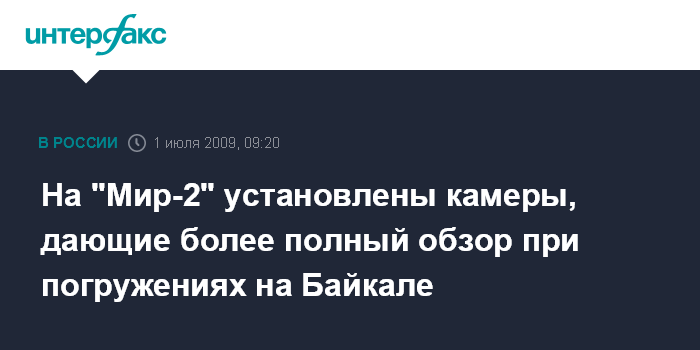 Москва. 1 июля. INTERFAX.RU - На глубоководный обитаемый аппарат (ГОА) "Мир-2" установлено новое оборудование - три видеокамеры, закрепленные по периметру аппарата, и дающие практически полный обзор толщи воды во время погружения на Байкале, сообщается в пресс-релизе Фонда содействия сохранению озера Байкал в среду.